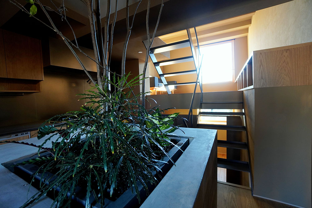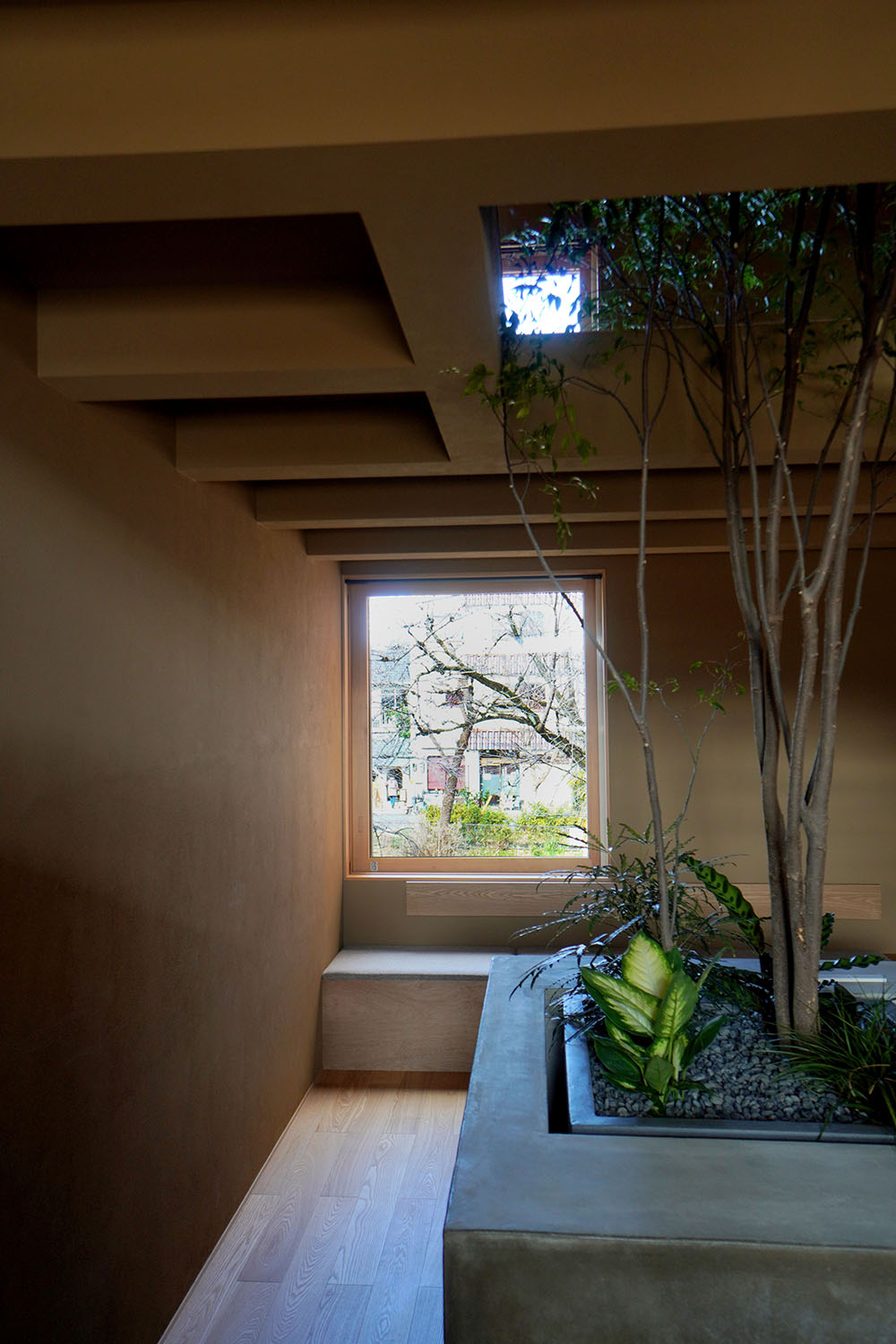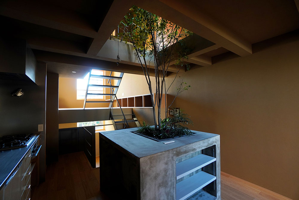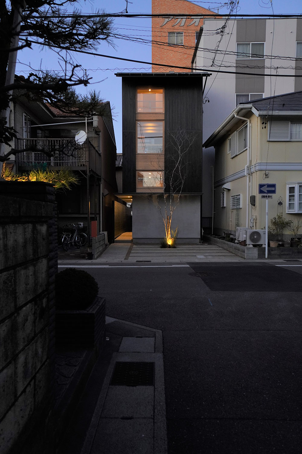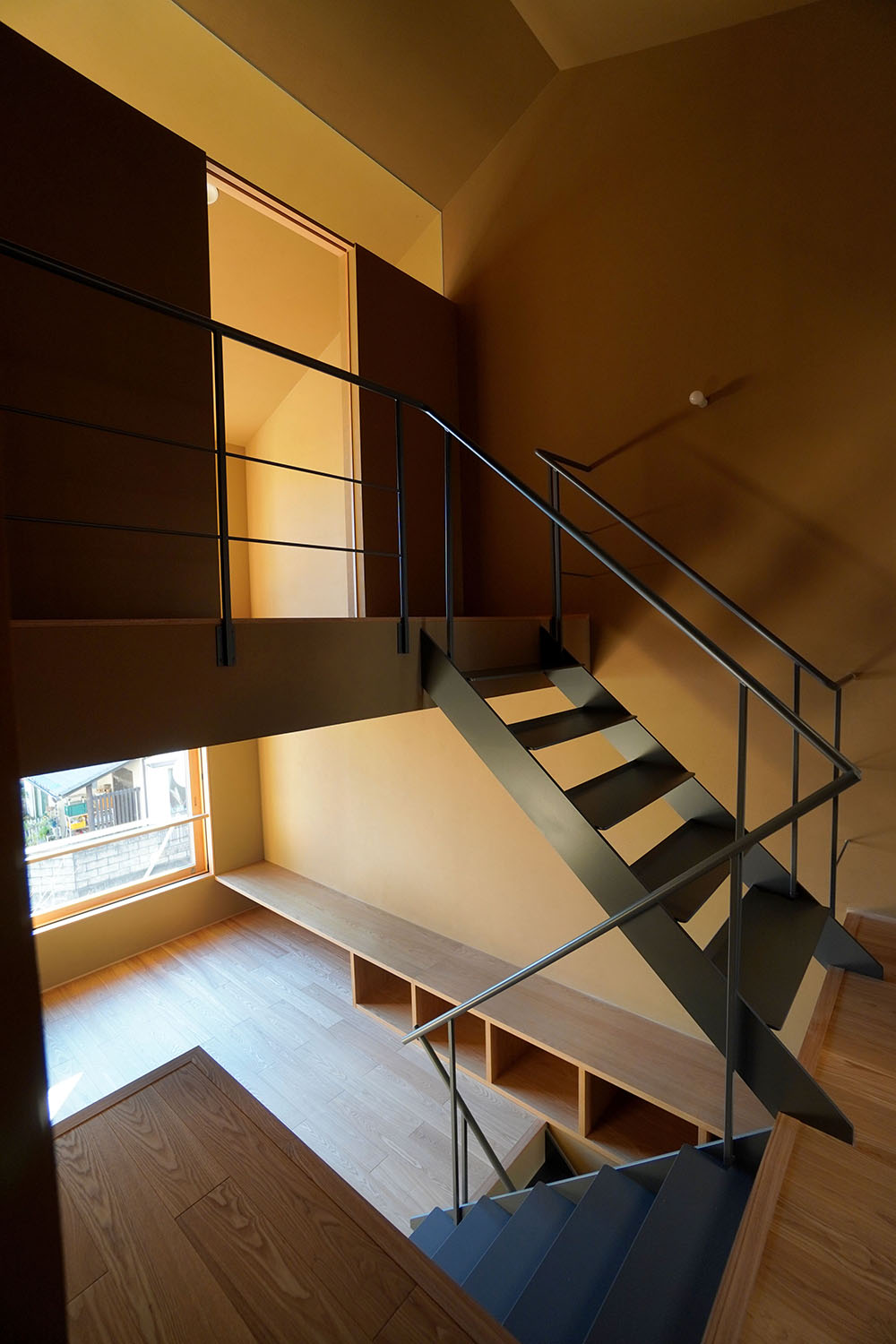 岐阜市の加納地区で3件目となる住宅。特に今回は敷地が狭く細長い。空間をとるために初めての3階建てとなった。木造住宅は3階建てになった途端に非常に厳しい条件となる。防火、耐火性能や構造計算など、複雑な手続きとコストアップに繋がる様々な条件。意匠性にも当然影響を与える。その中で可能な限り豊かな住環境を実現するために様々な工夫を行った。スキップフロアにすることで層によって空間を分け、次の空間に自然に繋がって行きながら徐々に個人的なプライベートな空間へと至るような構成にした。