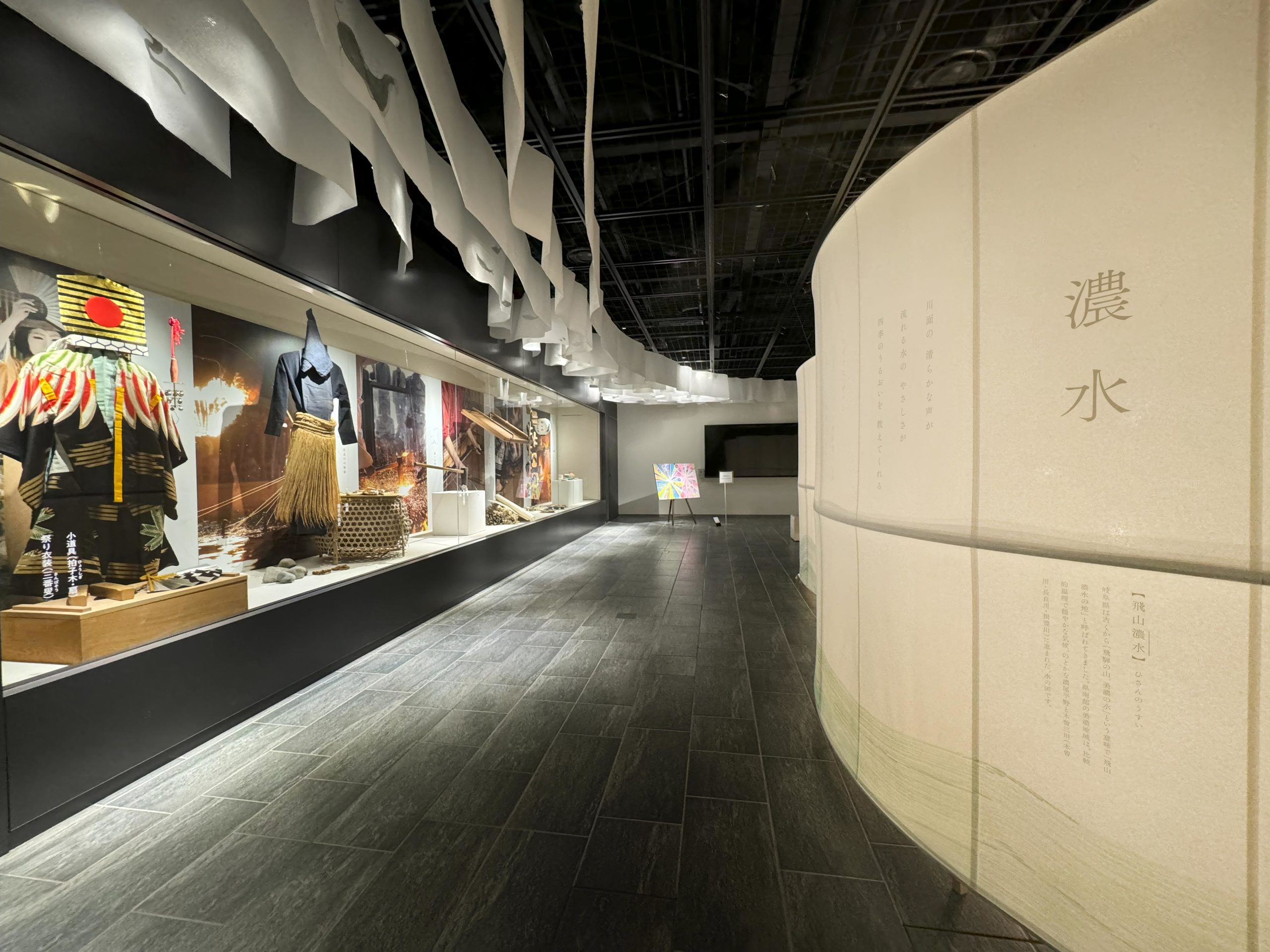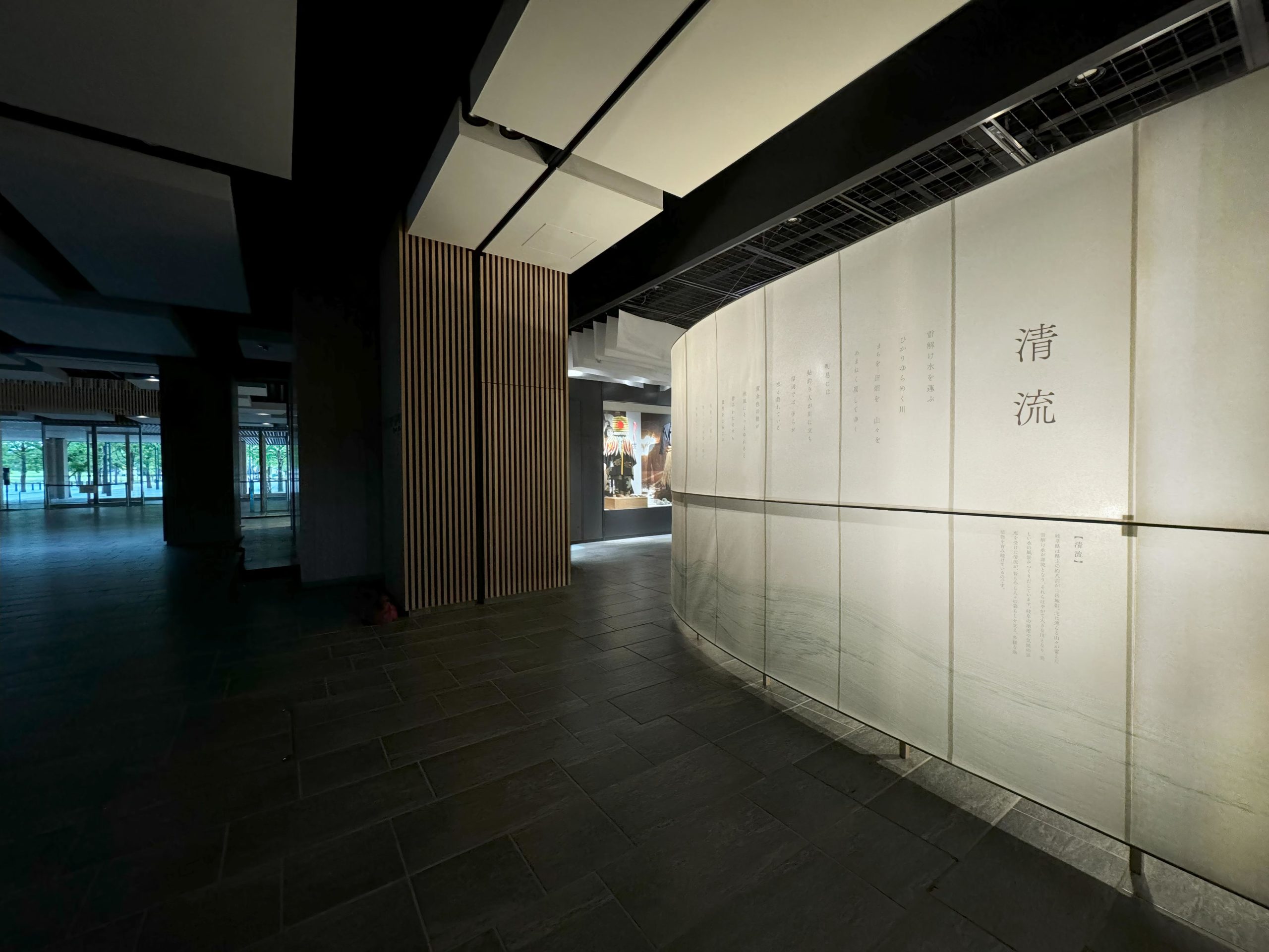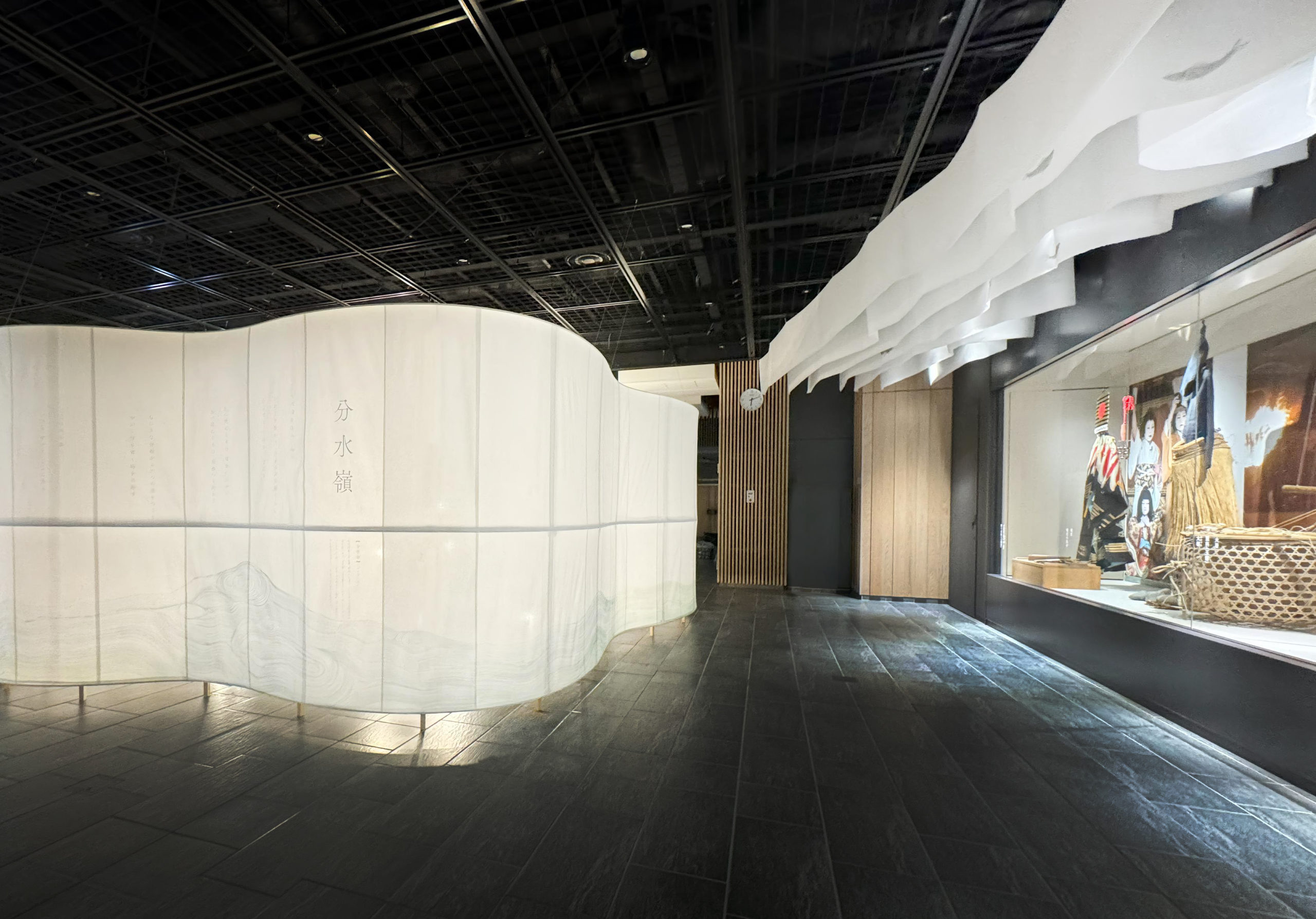 柔らかな和紙を使って空間を構成し導線も明確にし、空間ごとの展示物に集中できるような構成を意識した。和紙の壁は閉じた形にして、内部に照明を施して行灯のように光り、「清流」「濃水」「分水嶺」「飛山」の四つのテーマについて、県民のアイデンティティを象徴するような抽象的な詩を表現した。古代の和歌集より、美濃と飛騨にまつわる和歌を二首選定し、日本語カリグラフィで表現。スクリーン下部には、「ひとつながりの川」を現場での筆入れによって表現し、「分水嶺」を中心として「飛騨」「美濃」に水が流れ、文化も一つに繋がっているイメージを抽象的に表現した。
