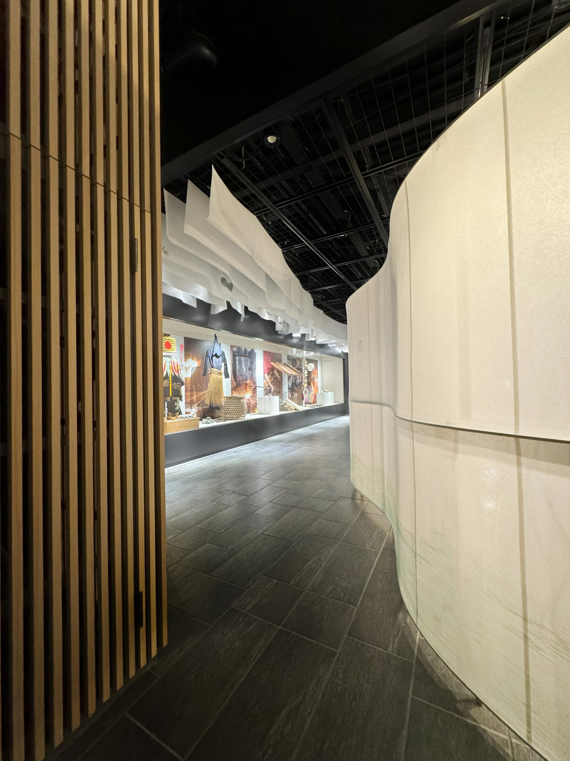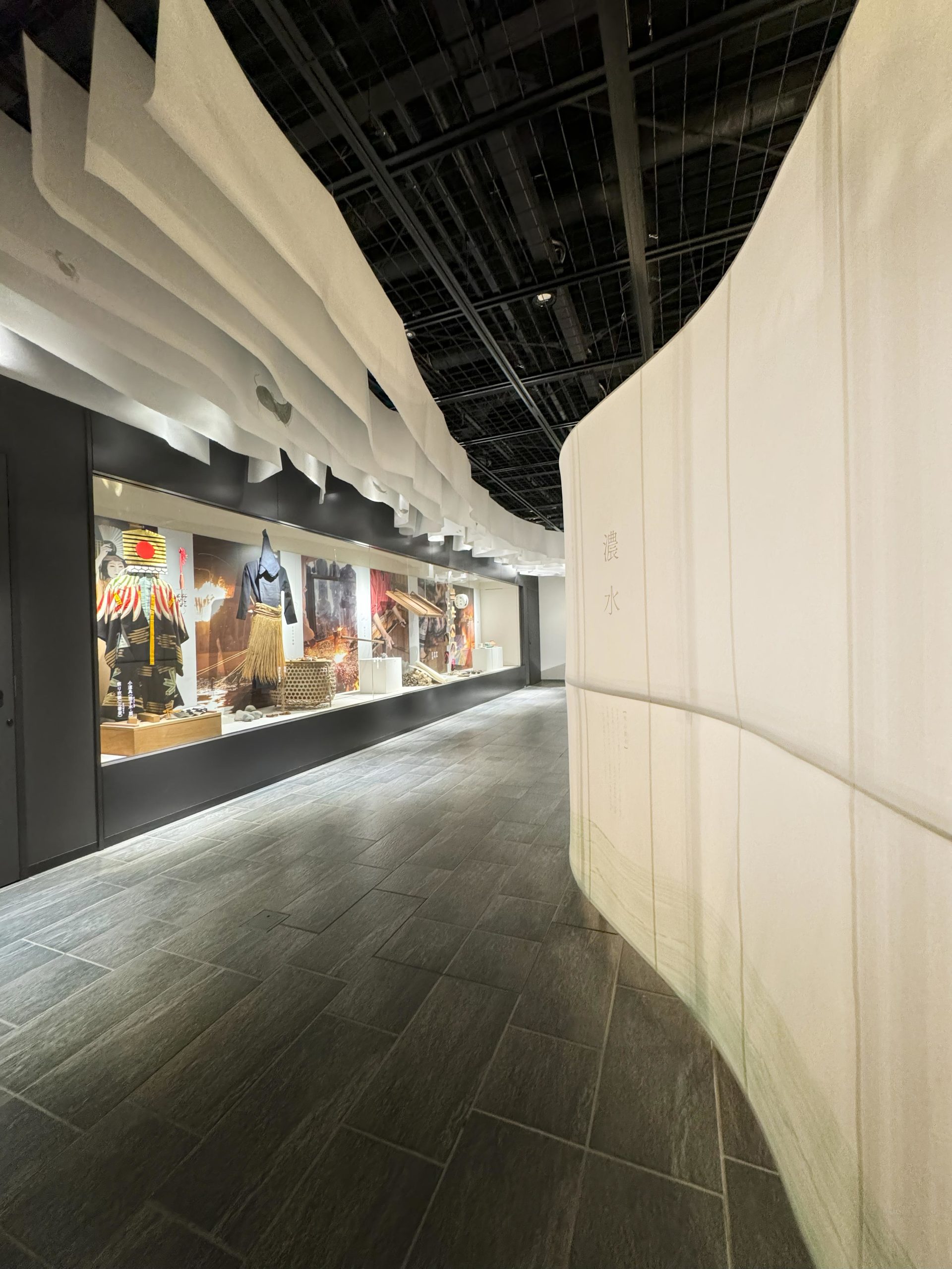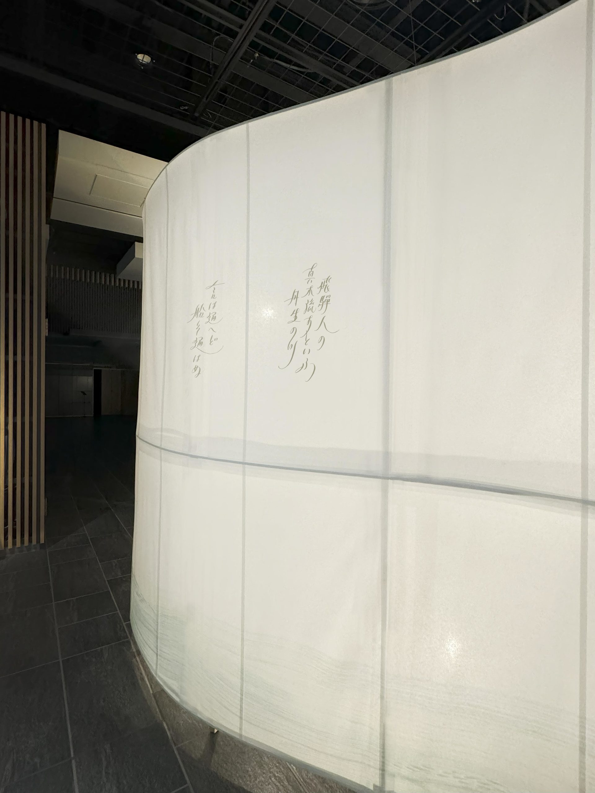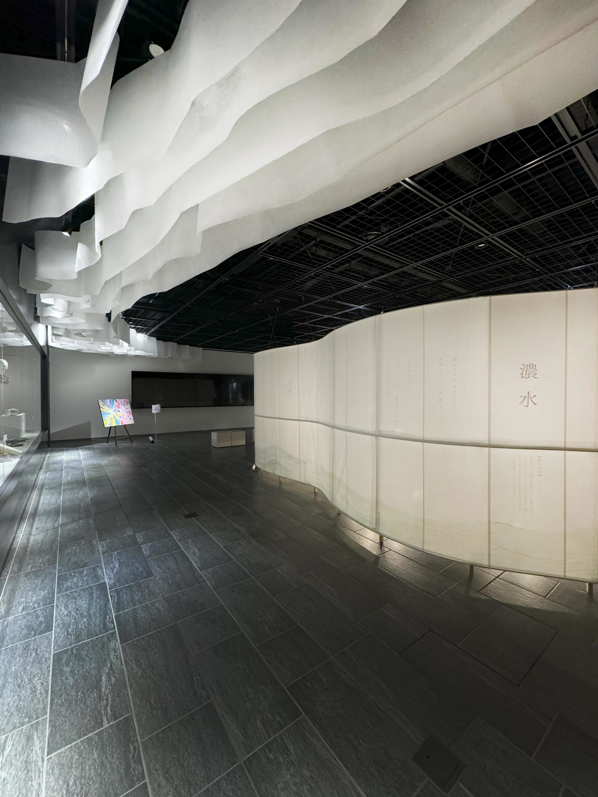 柔らかな和紙を使って空間を構成し導線も明確にし、空間ごとの展示物に集中できるような構成を意識した。和紙の壁は閉じた形にして、内部に照明を施して行灯のように光り、「清流」「濃水」「分水嶺」「飛山」の四つのテーマについて、県民のアイデンティティを象徴するような抽象的な詩を表現した。古代の和歌集より、美濃と飛騨にまつわる和歌を二首選定し、日本語カリグラフィで表現。スクリーン下部には、「ひとつながりの川」を現場での筆入れによって表現し、「分水嶺」を中心として「飛騨」「美濃」に水が流れ、文化も一つに繋がっているイメージを抽象的に表現した。