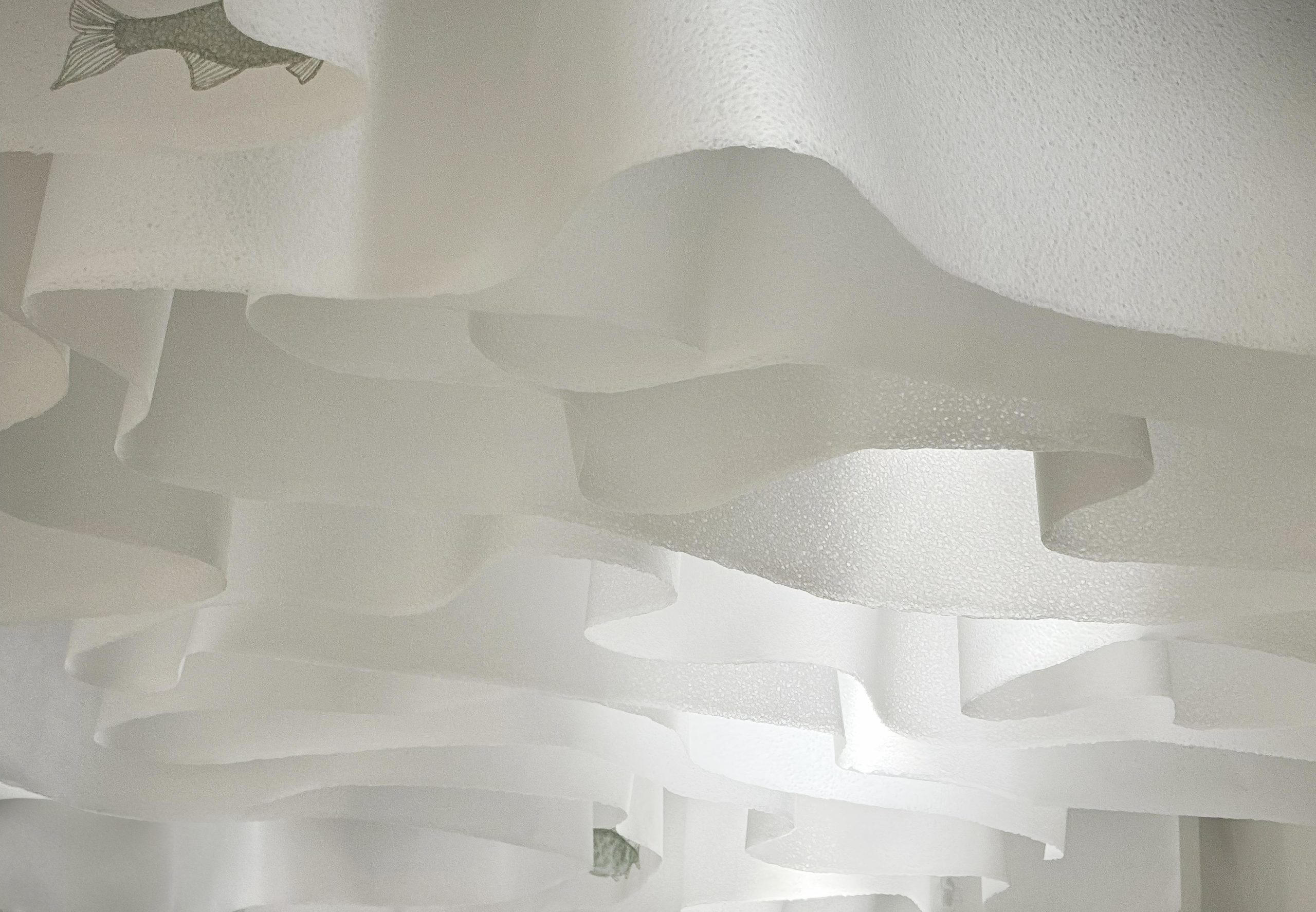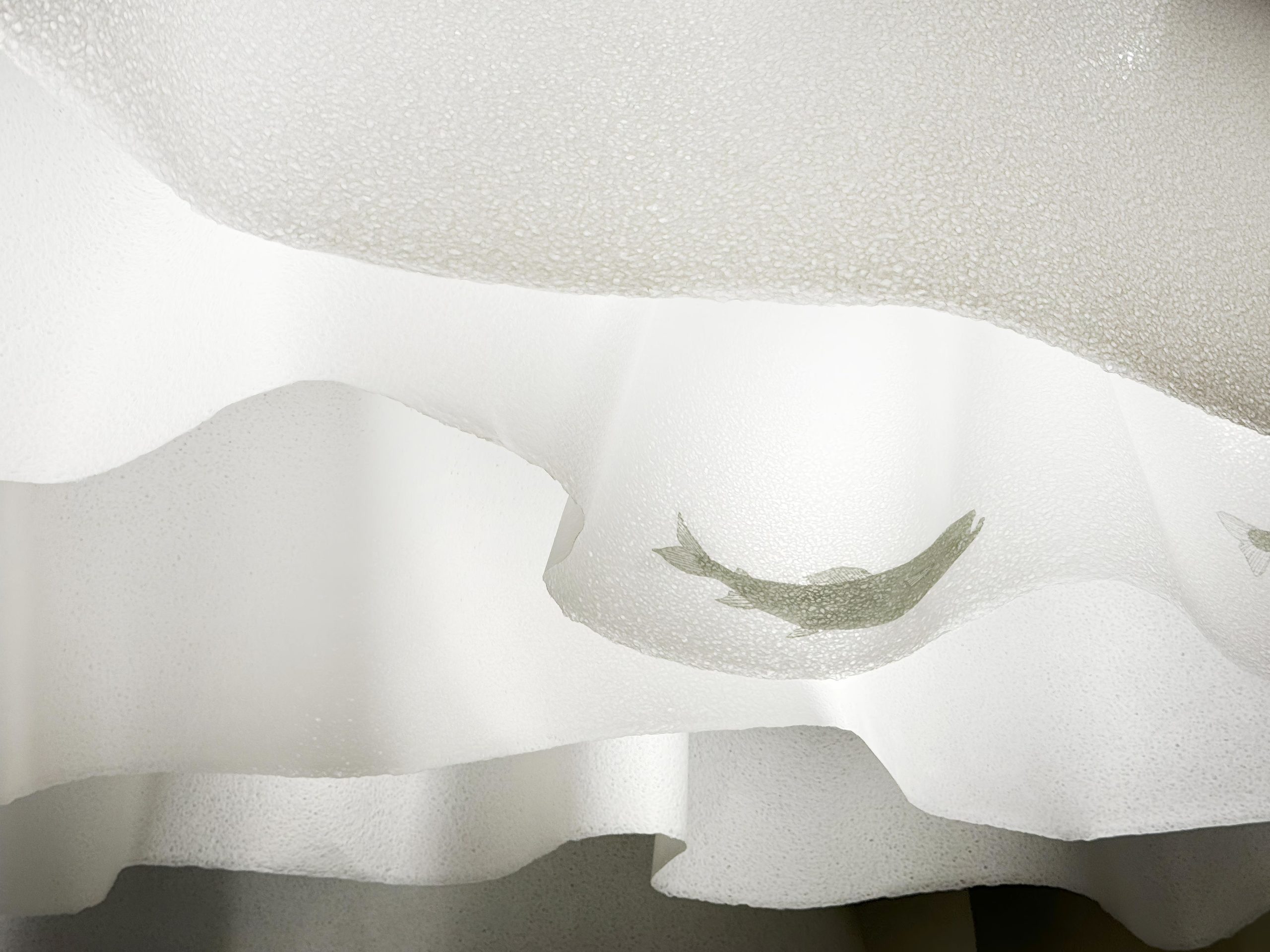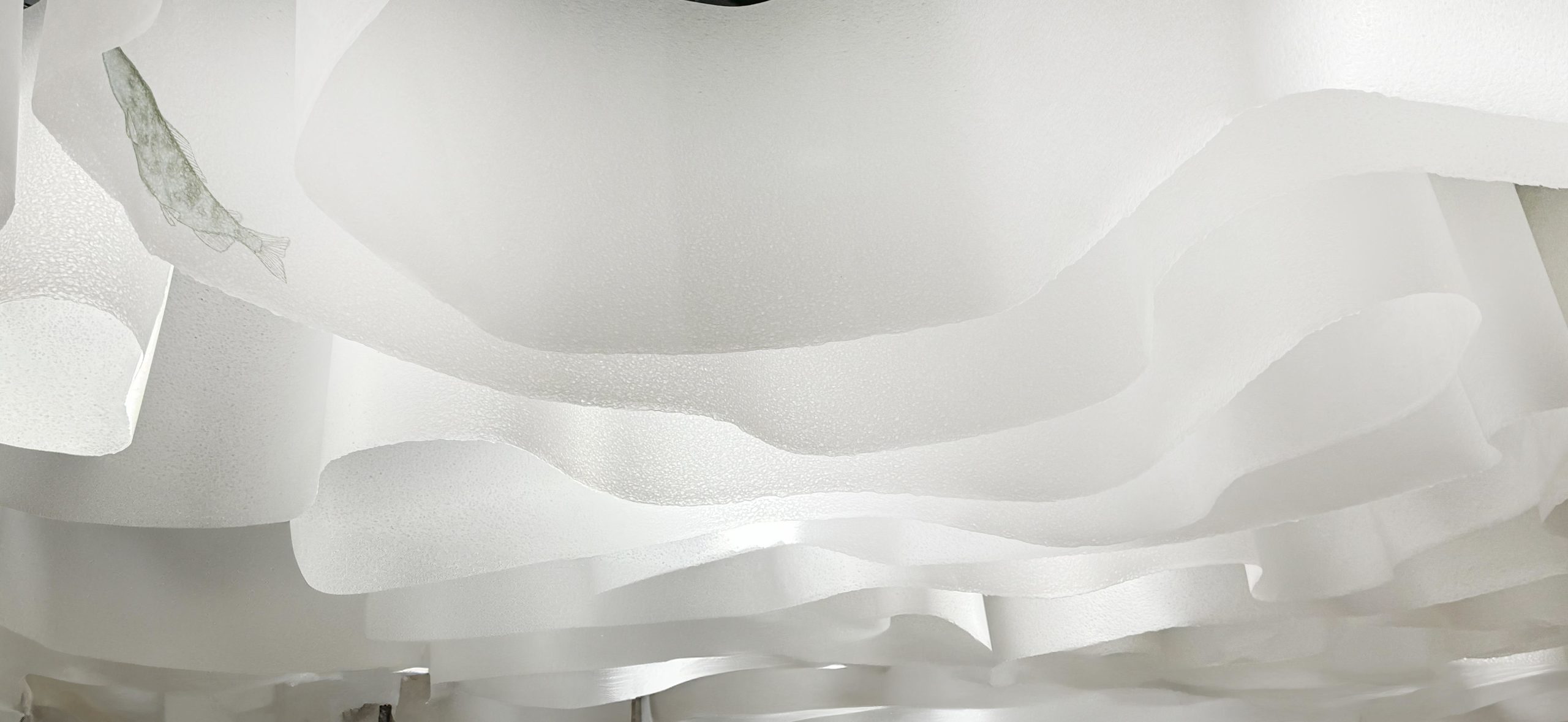 美濃和紙で出来たスクリーンは、入口から出口に至るまで「ひとつながりの川」をイメージした。分水嶺から分かれたそれぞれの水はそれぞれの場所で潤いを与え、豊かな農産物、伝統文化、芸術などが産まれた。飛騨では山の恵みを与え、祭りなどの文化をはぐくみ、美濃では水田を潤し和紙や鵜飼などの水との関わりの深い文化が育った。常に流れるその水は常に変化をしながらも人々のアイデンティティの源となり、営みの土台として岐阜県に住む人のこころに深く刻まれた「水」の記憶。全ては分水嶺から始まり、流れ込んだそれぞれの地域でそれぞれの文化が花開くが、その源流はひとつ。文化は繋がり、歴史とともに変化し、時は流れ続ける。